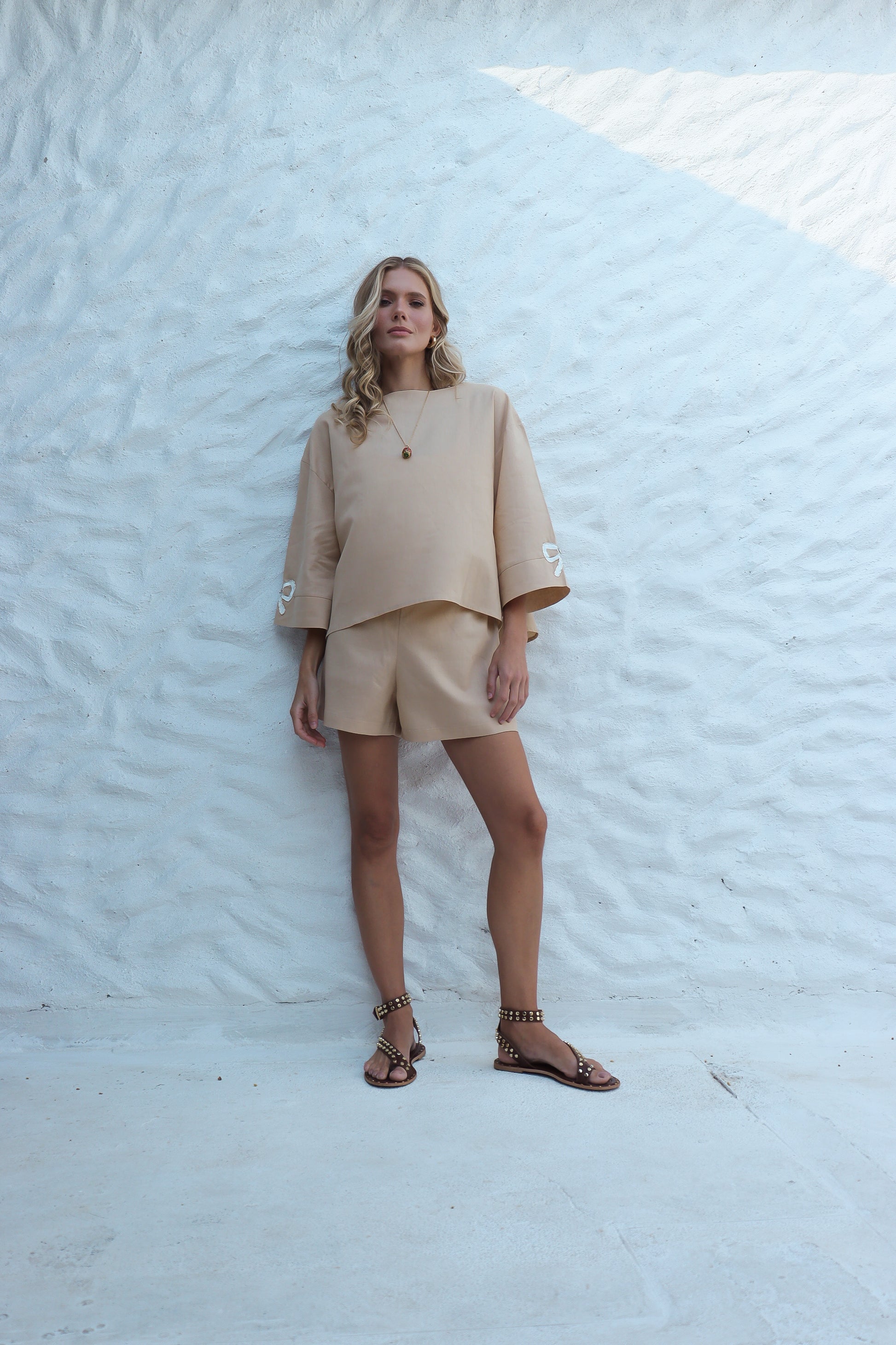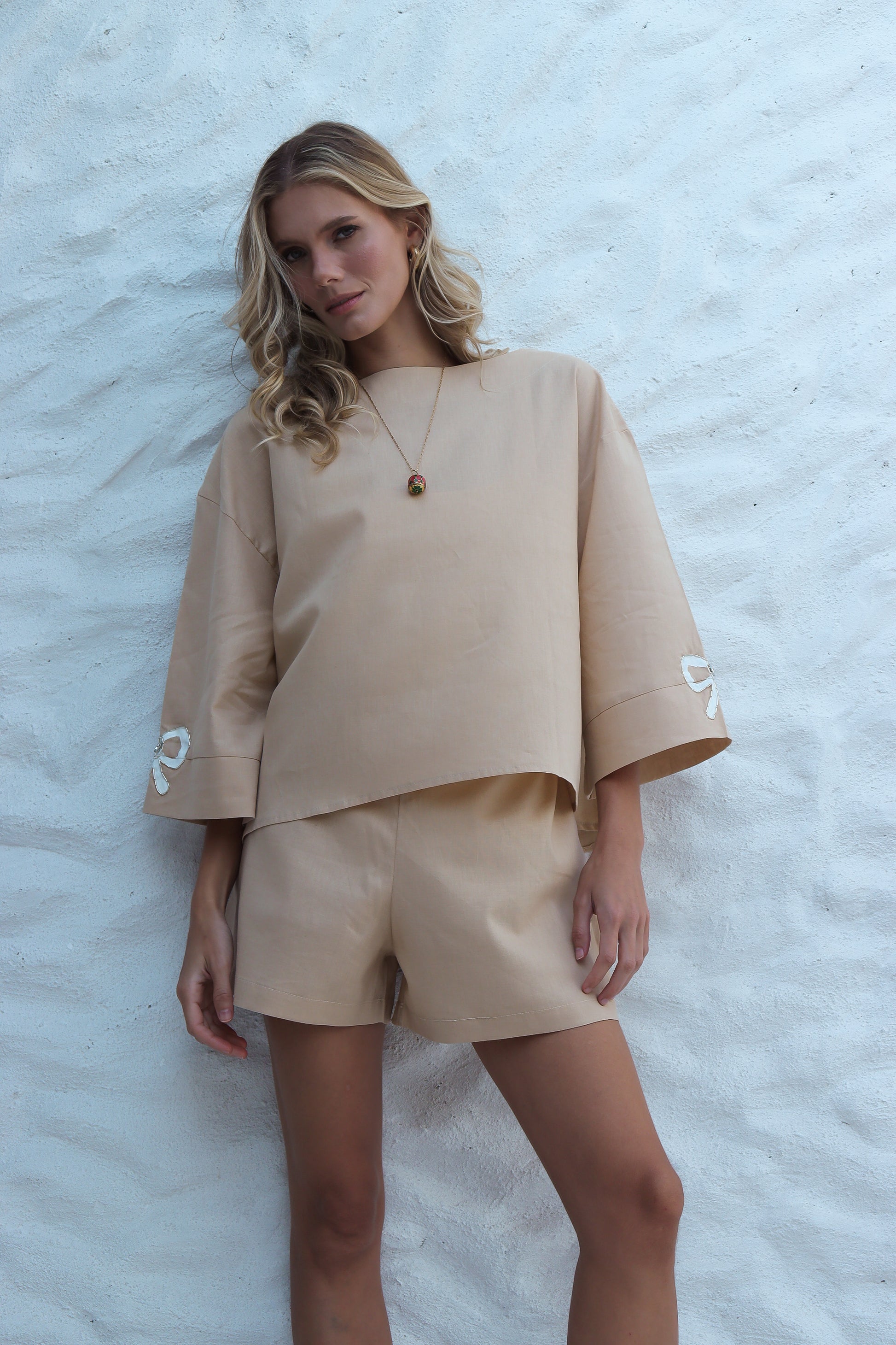 Bata em linho, com decote canoa e mangas amplas que garantem leveza e sofisticação.