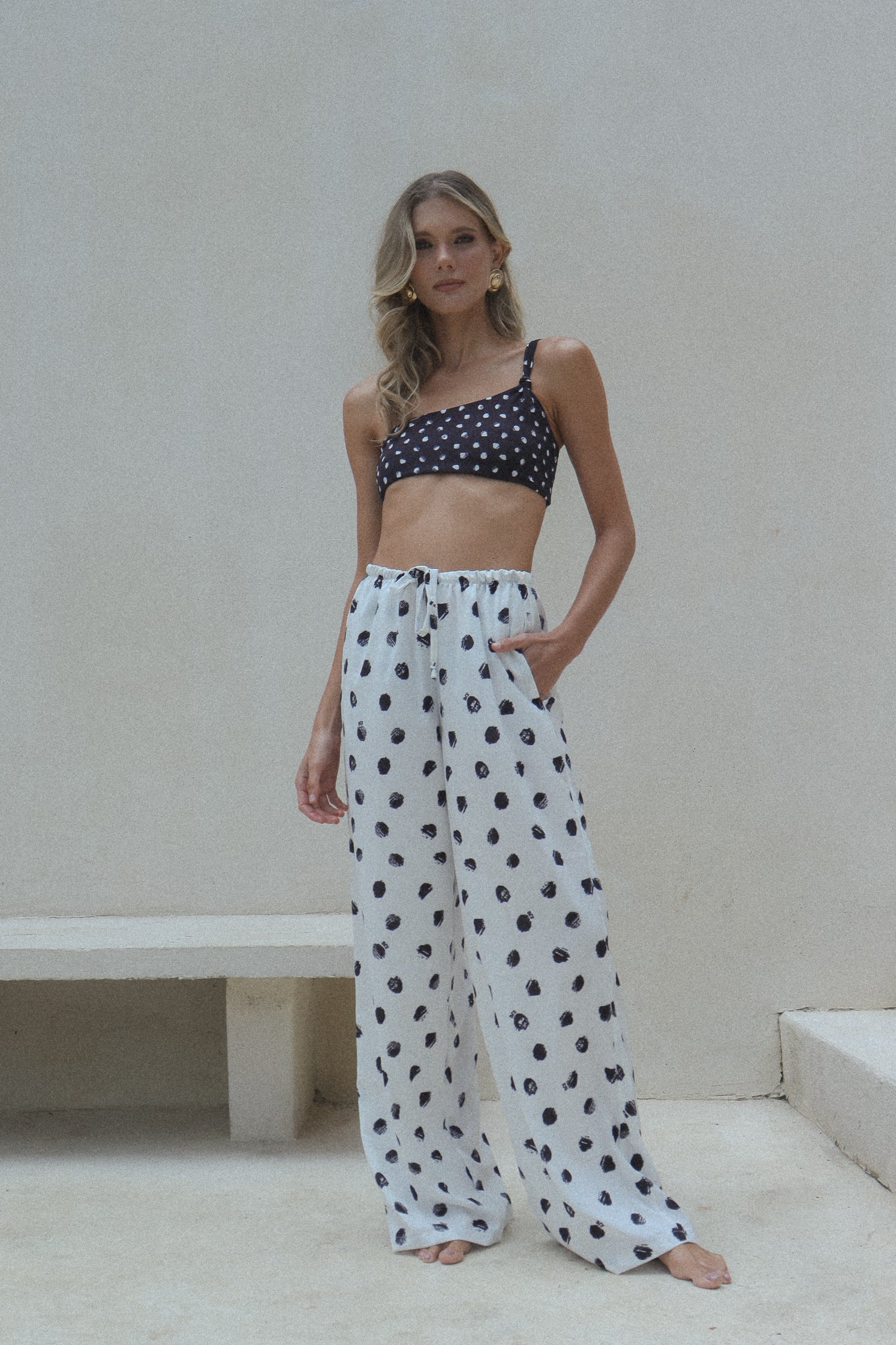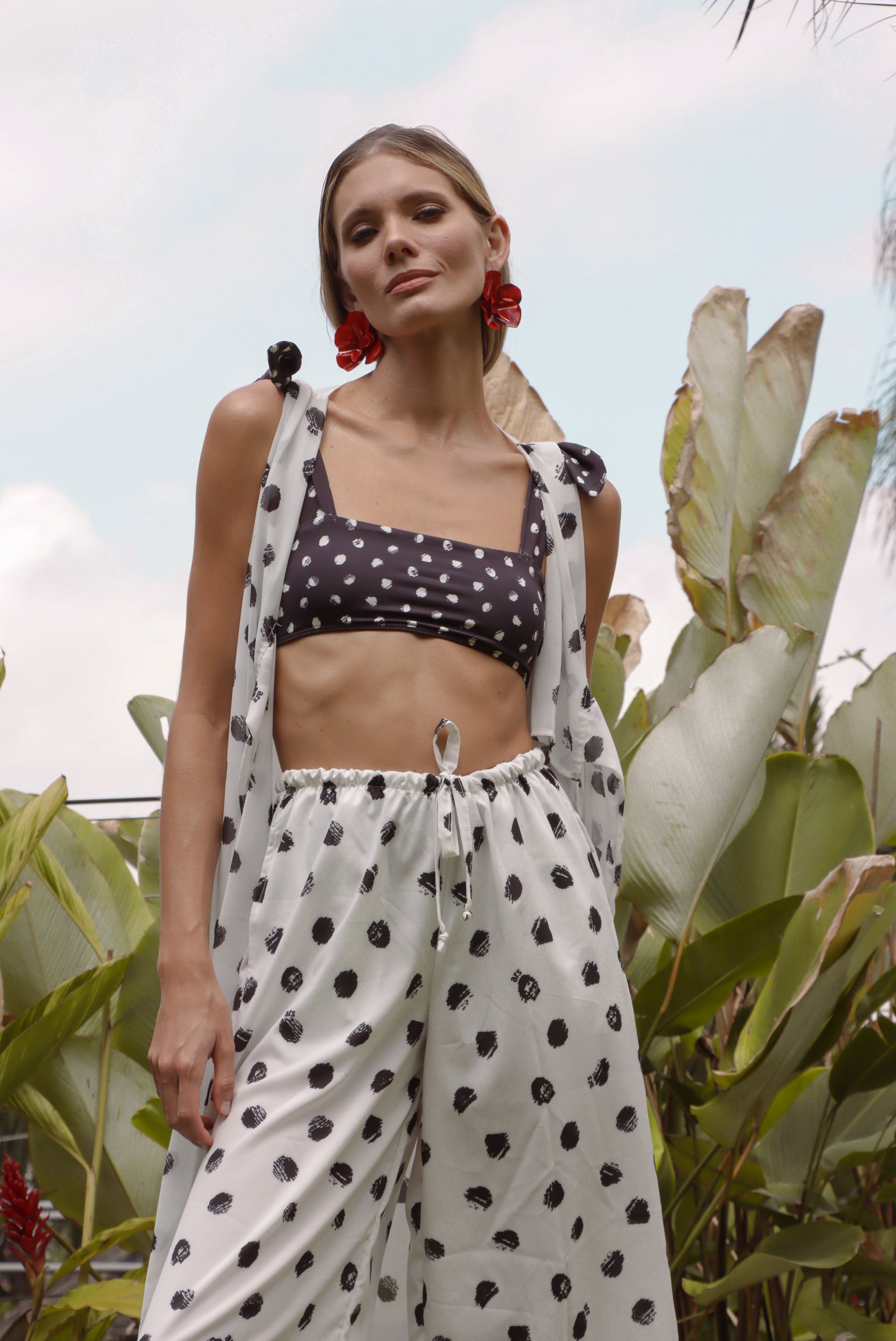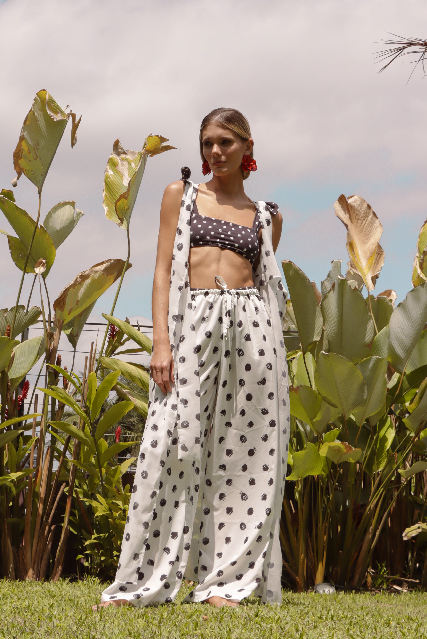Calça em crepe estilo pantalona, com elástico na cintura e amarração.