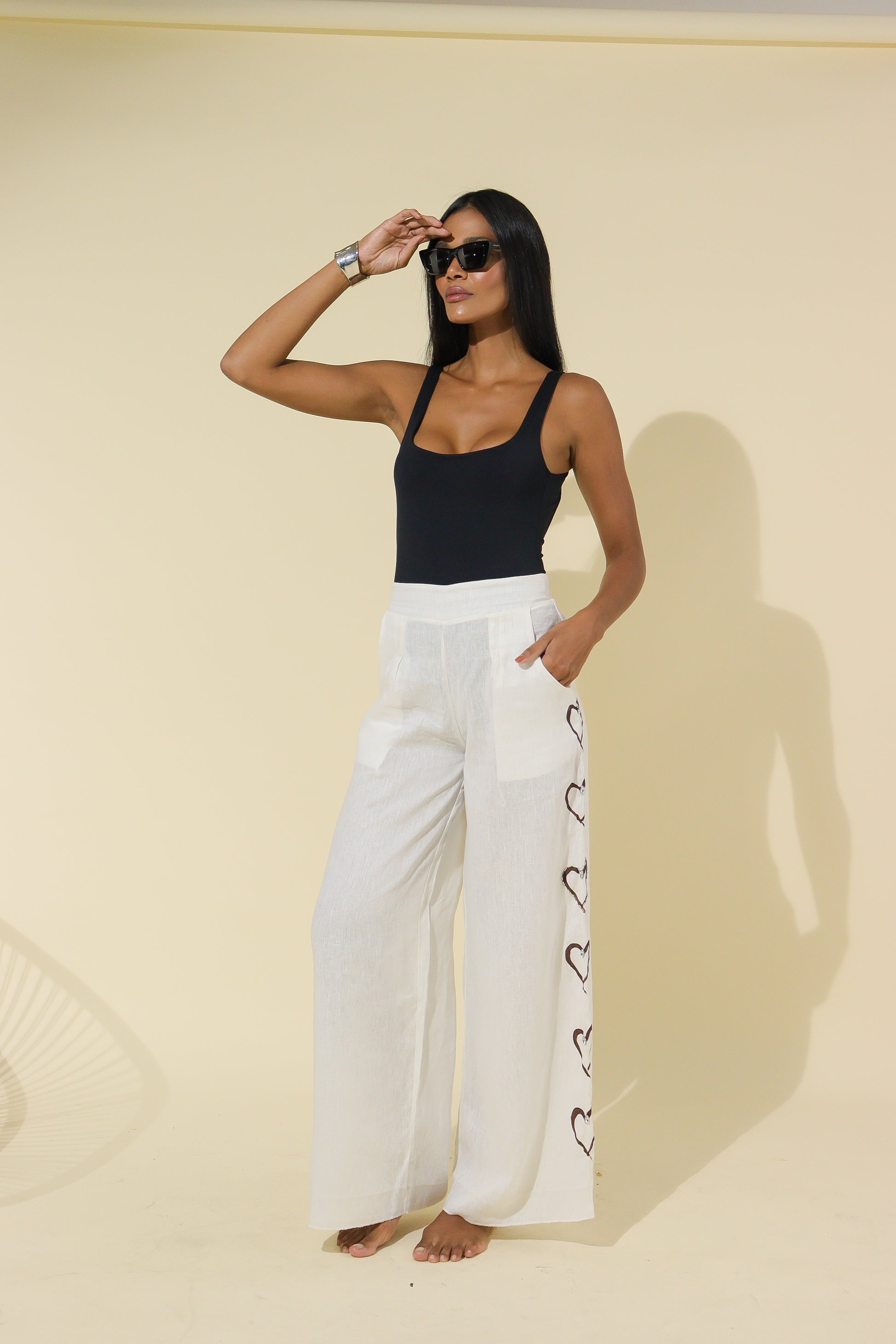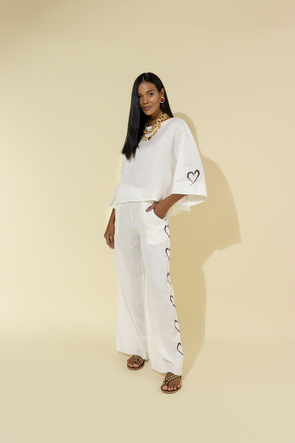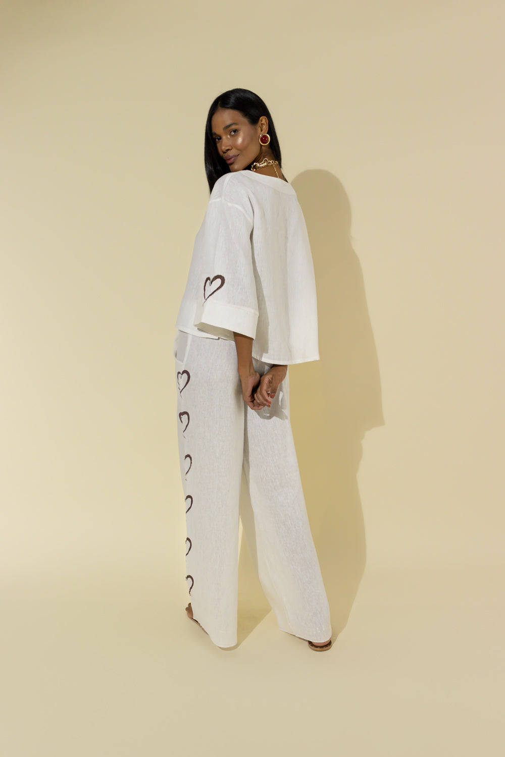 Calça pantalona em linho, com caimento leve e sofisticado.