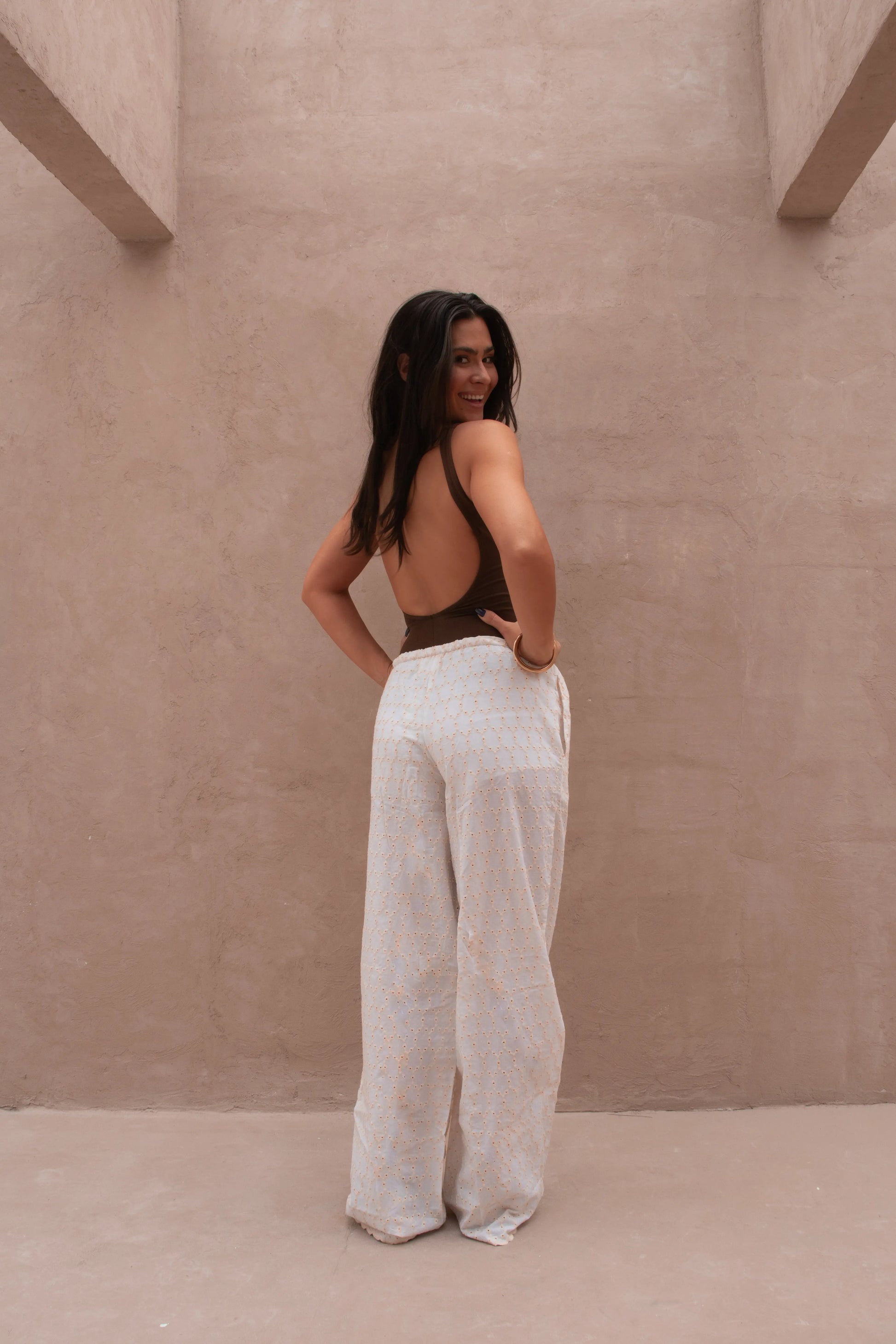 Calça em algodão, modelo reto. Possui elástico na cintura com amarração e bolsos. A ponteira da amarração é finalizada com bolinhas de olho grego em murano.