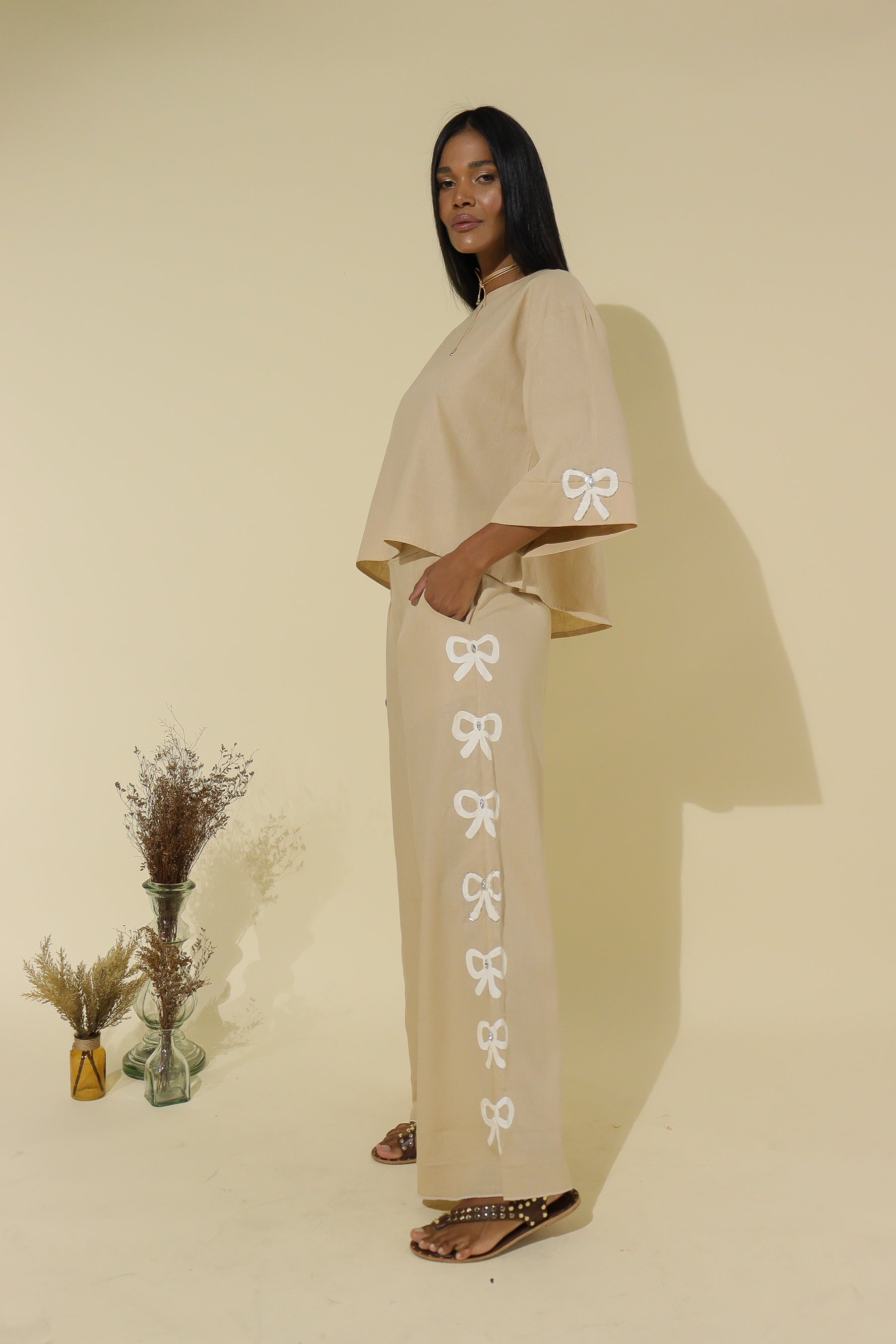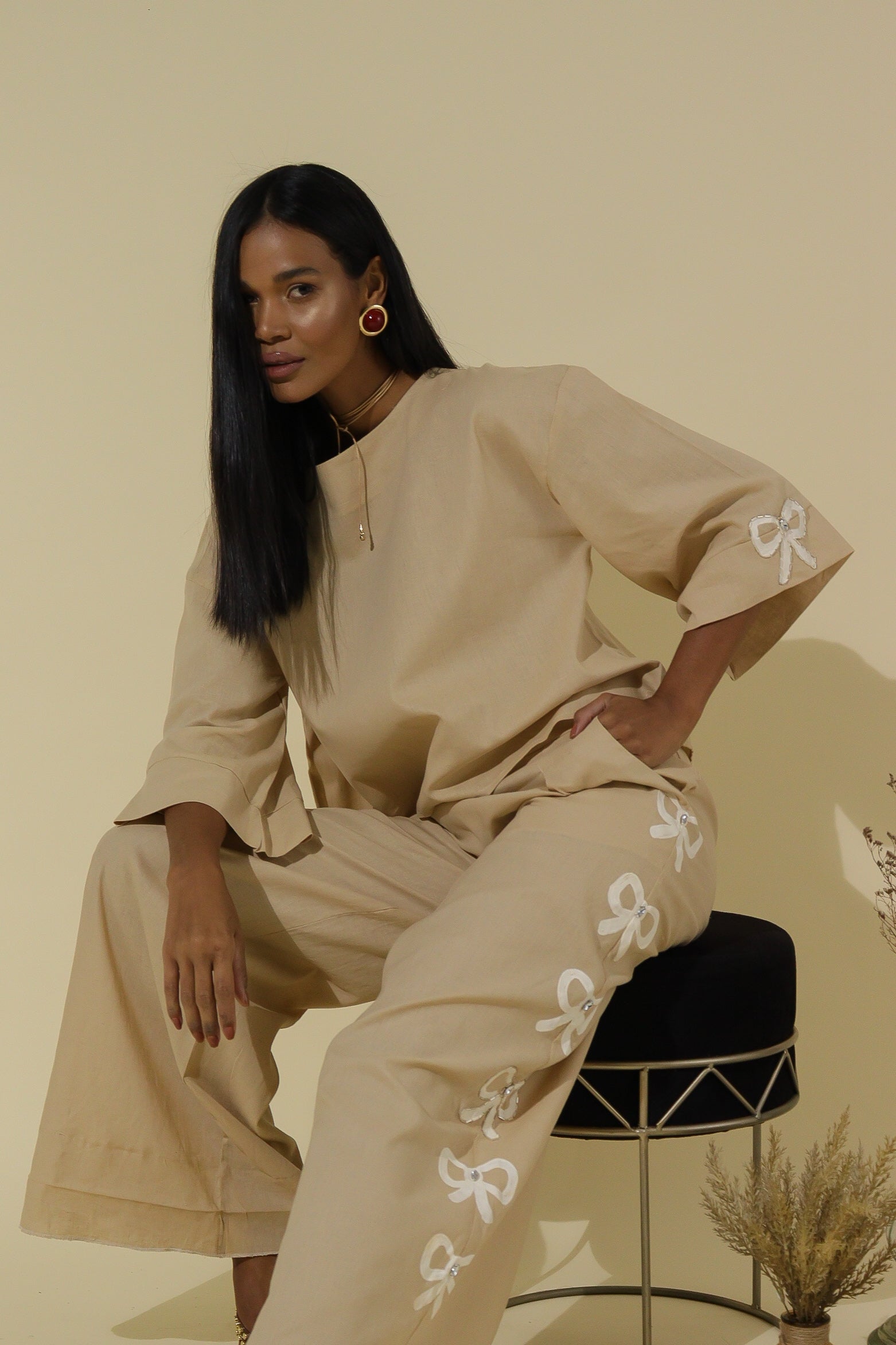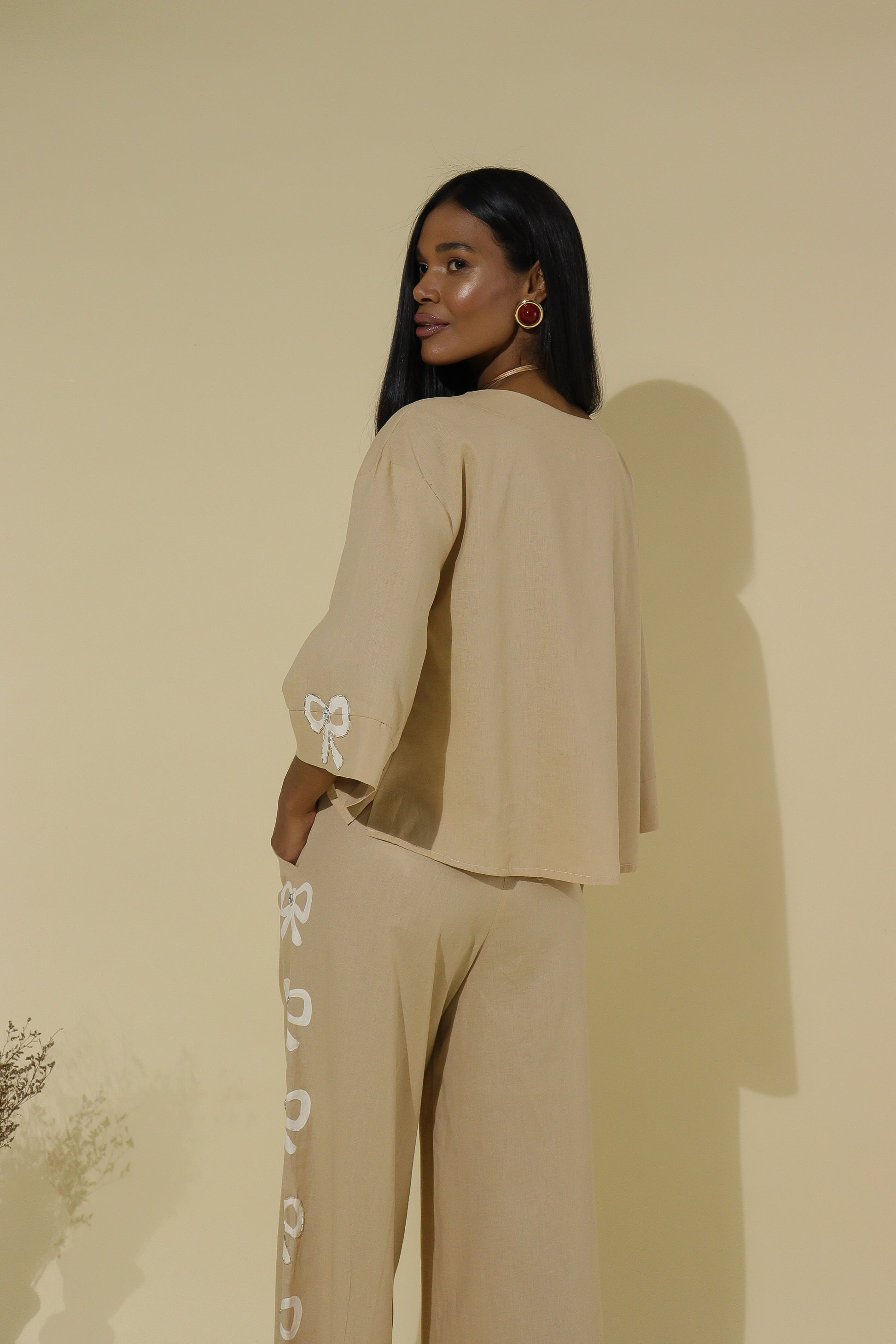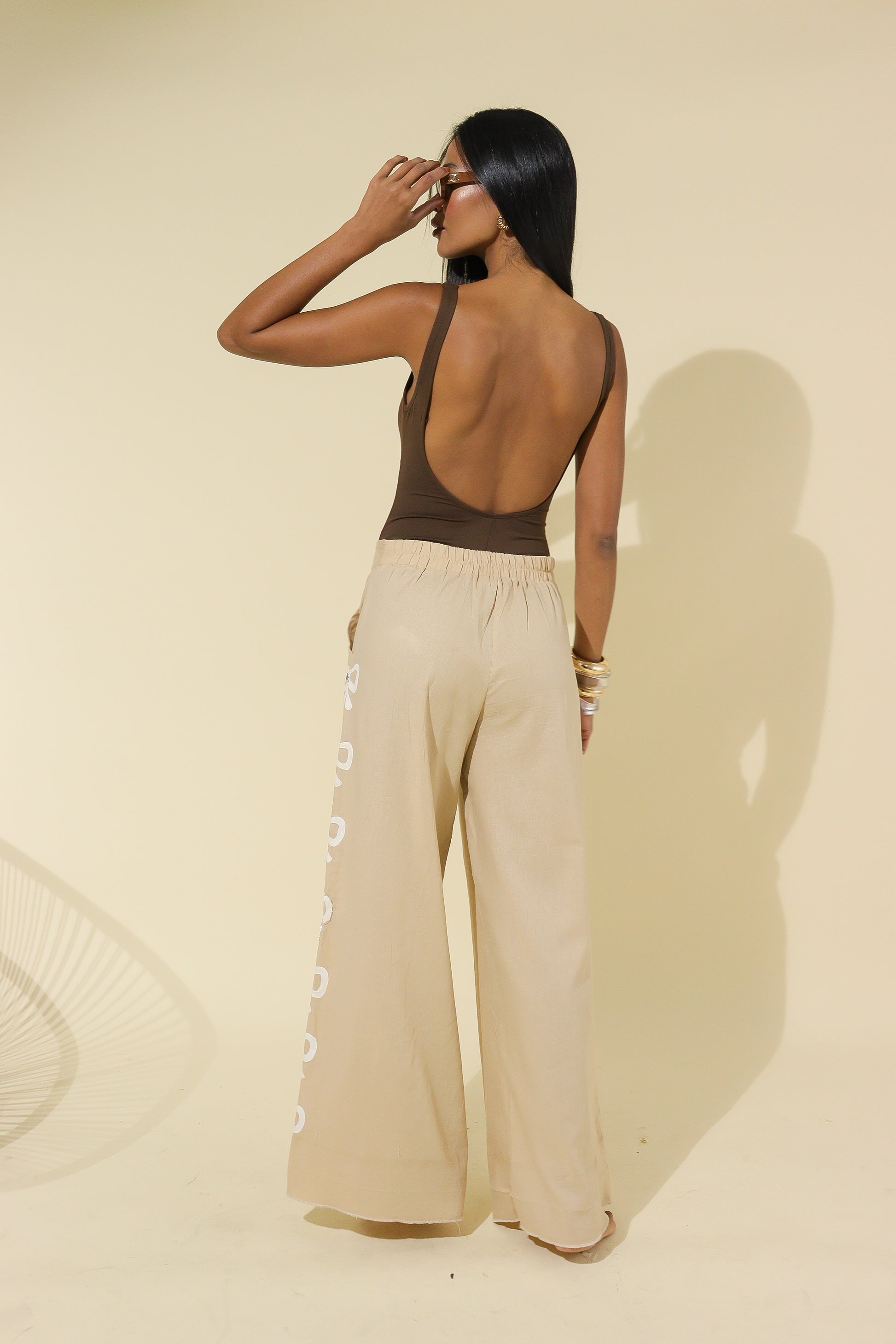 Calça pantalona em linho, com caimento leve e sofisticado.