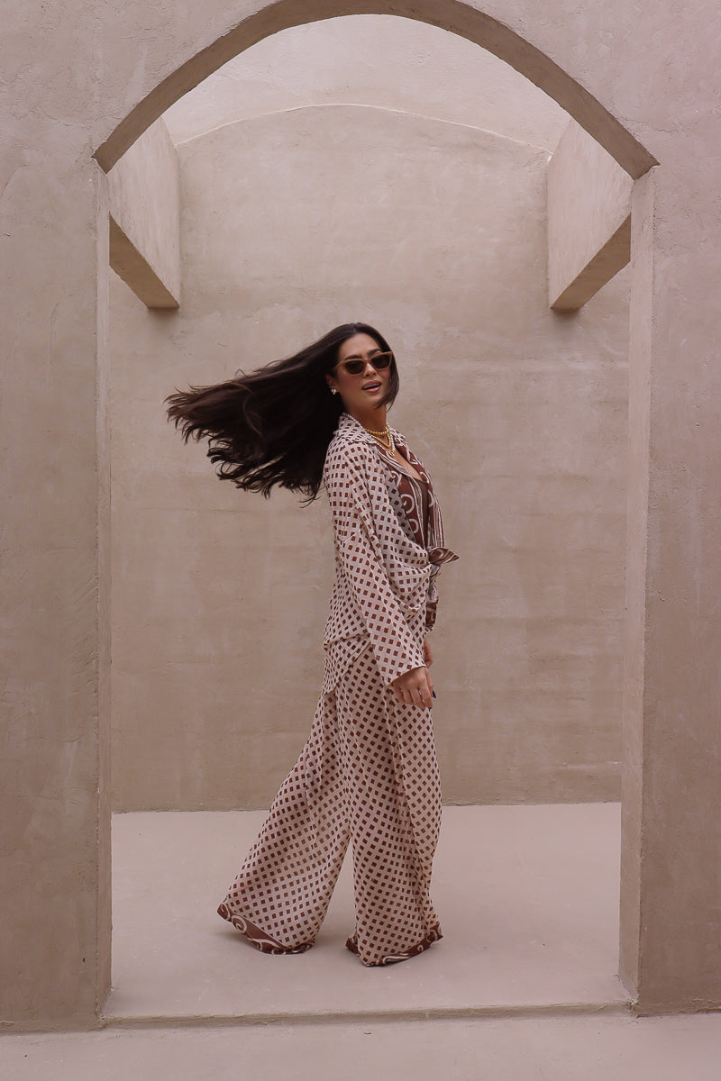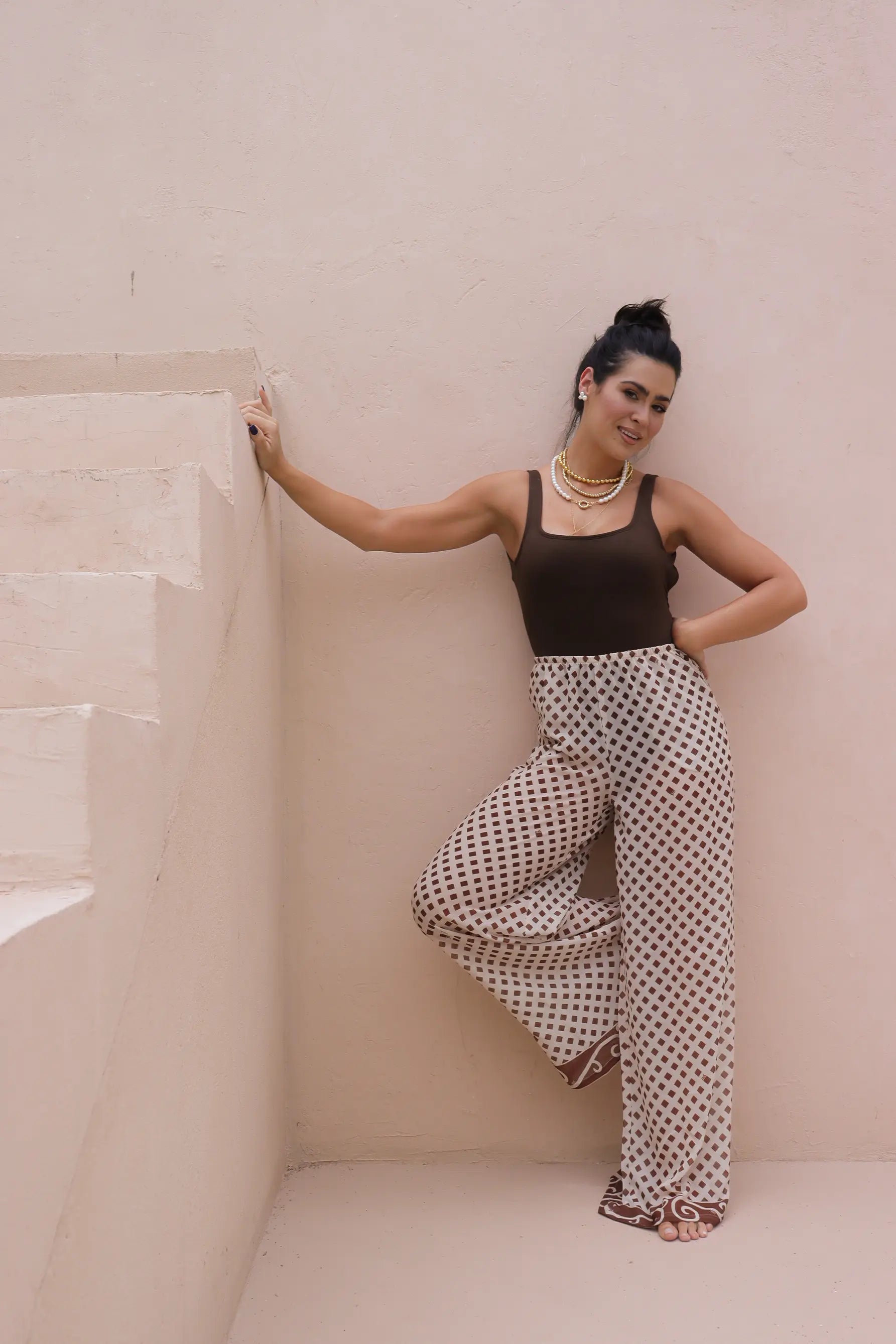Calça em toque de seda estilo pantalona, com elástico na cintura.