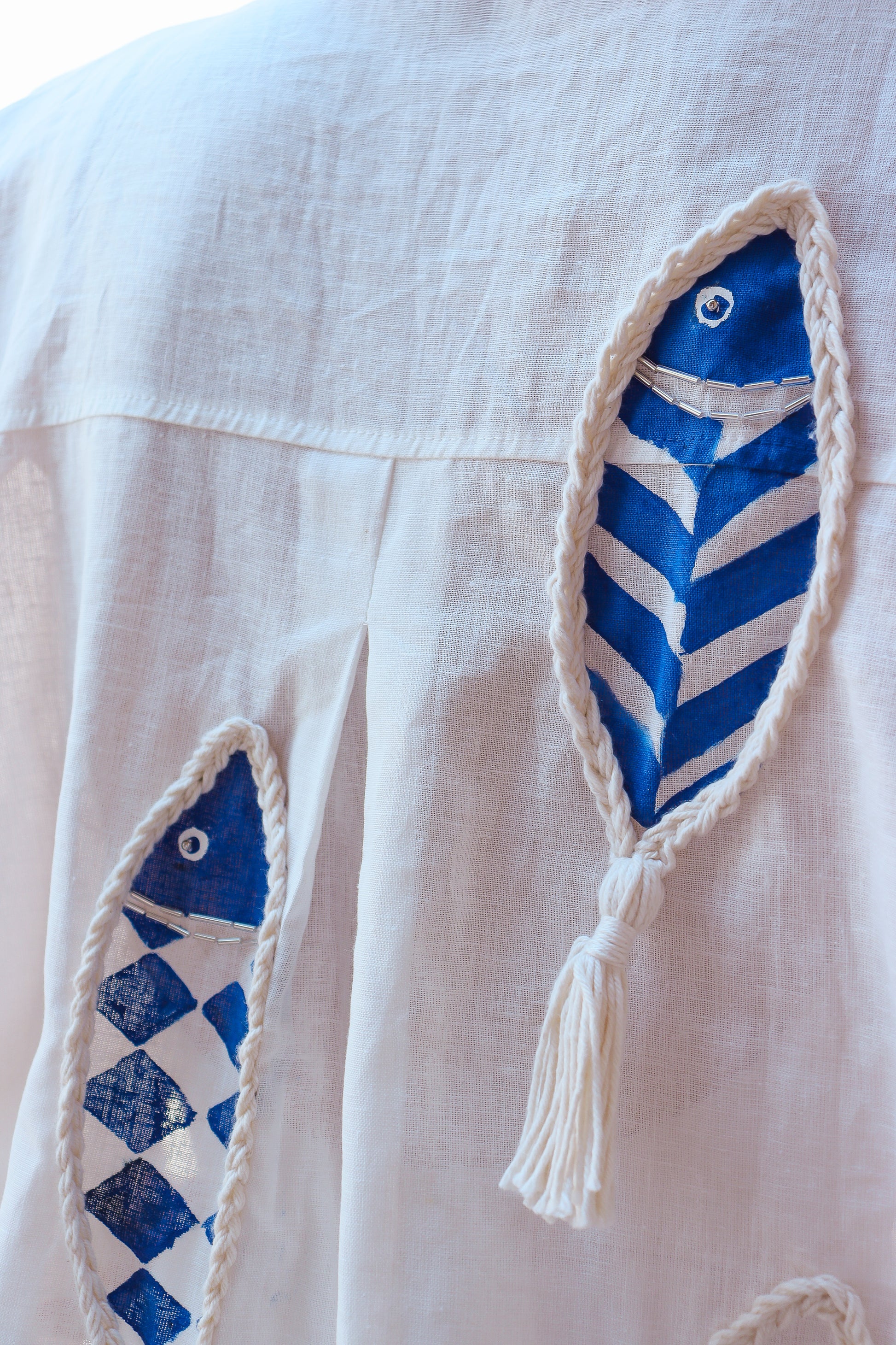 Esta camisa será pintada e bordada à mão quando você comprar.