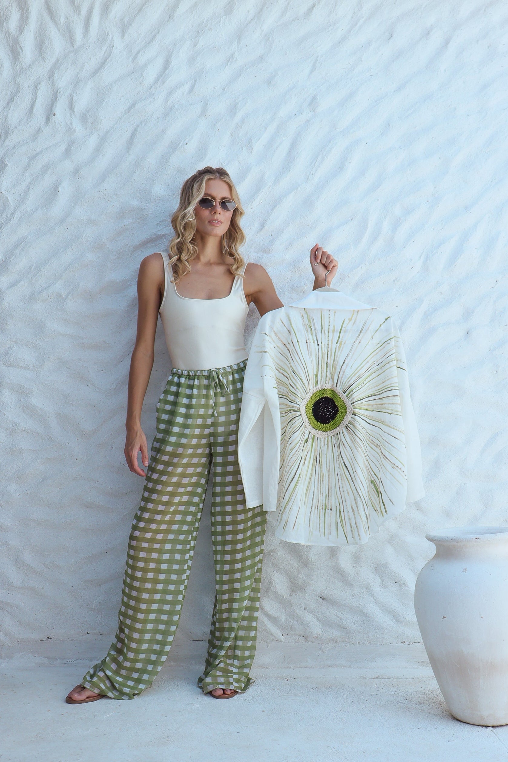 Esta camisa será pintada e bordada à mão quando você comprar.