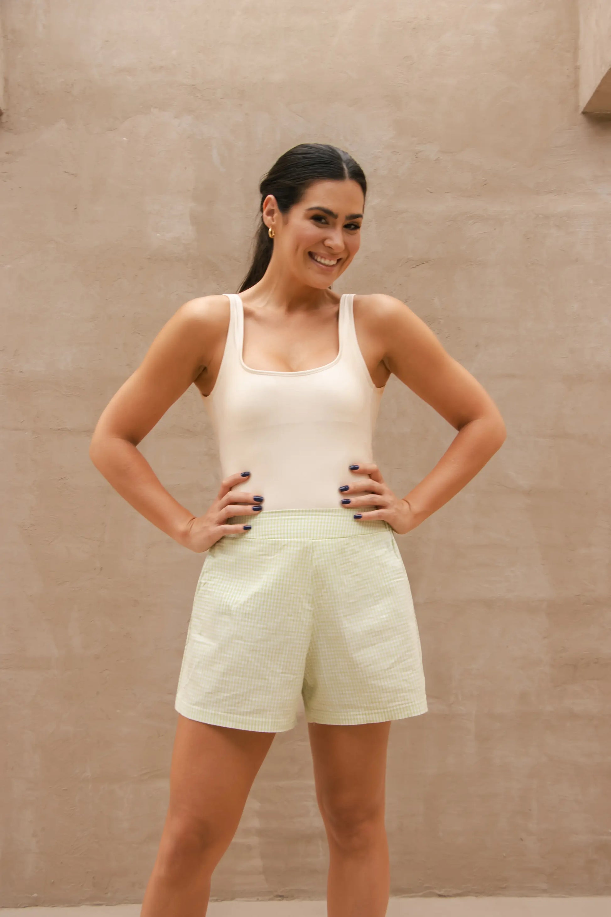 Possui cós liso na frente e elástico nas costas, garantindo ajuste confortável e melhor caimento.