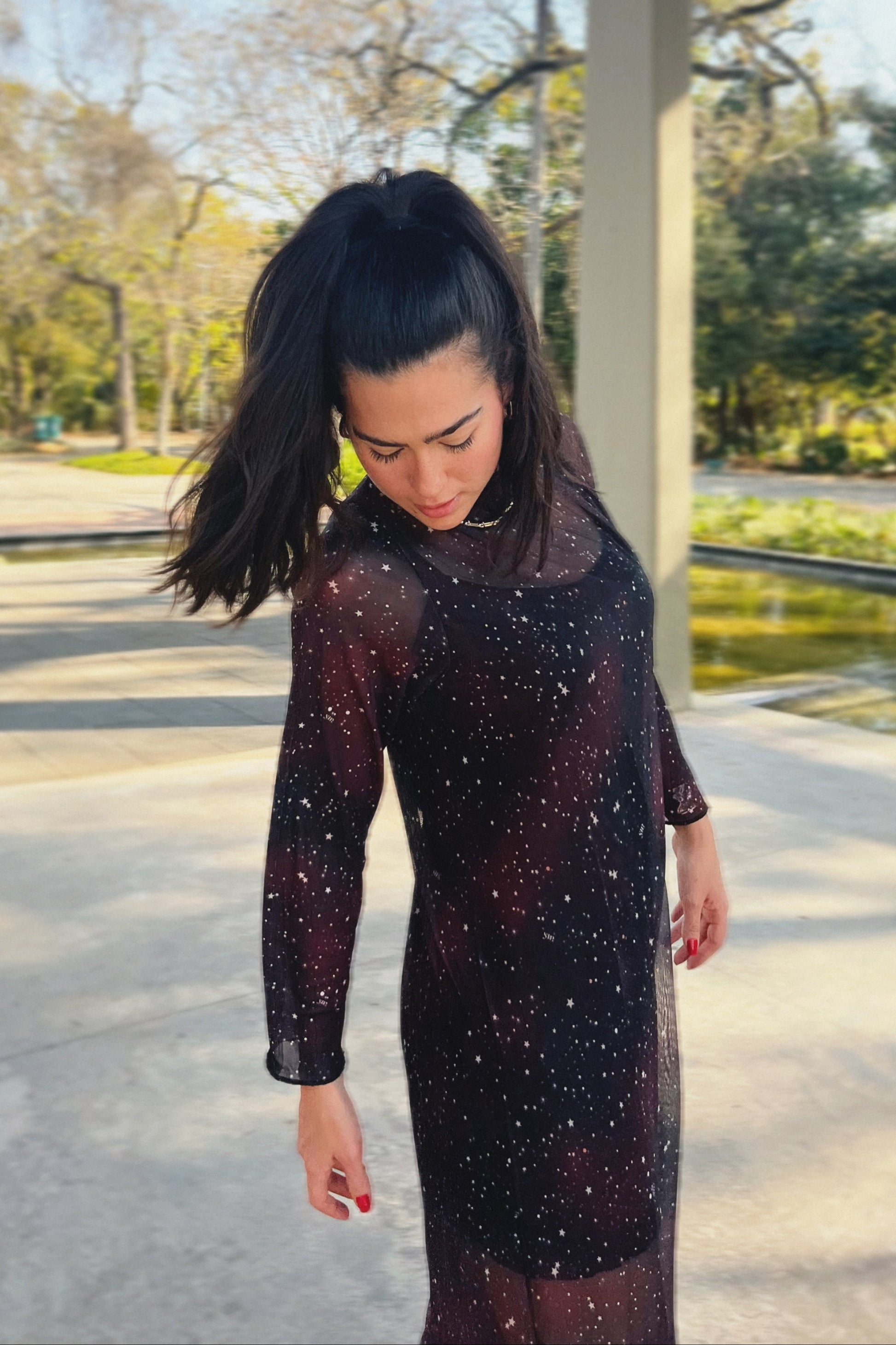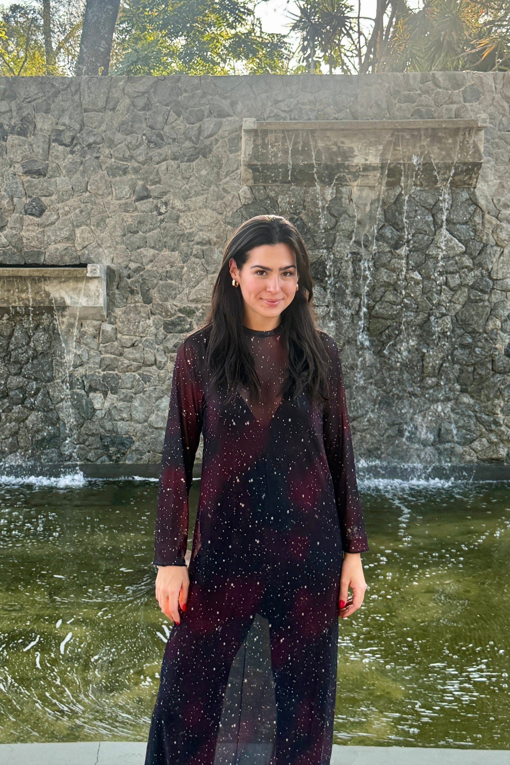 Vestido em tule, modelo regata, possui duas fendas nas laterais.